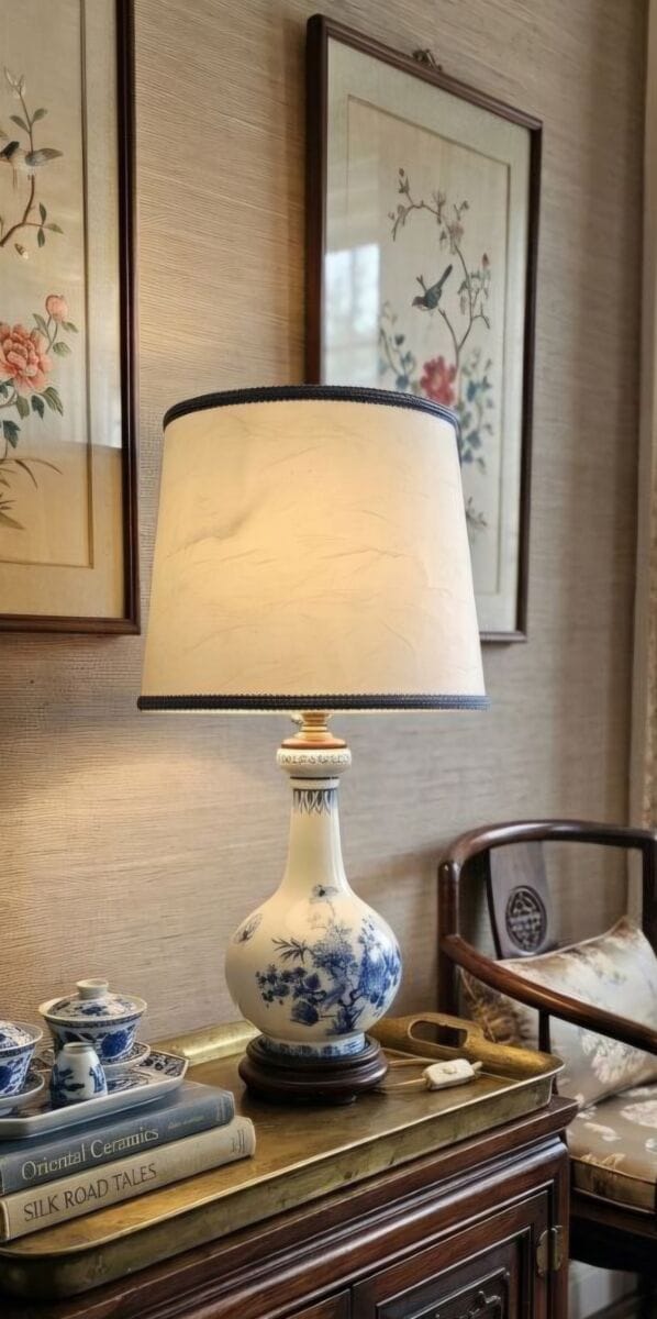 Želite pridih brezčasne elegance v svojem domu? Potem bo ta čudovita vintage namizna svetlika v chinoiserie slogu ravšnja za vas. Osrednji del je poslikan z motivi cvetja in metuljev, simboli sreče in harmonije. Stoji na masivnem lesenem podstavku, celoto pa dopolnjuje teksturiran krem senčnik z elegantno modro obrobo, ki poskrbi za prijetno svetlobo.