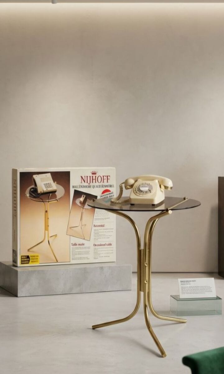 Mizica ima ogrodje iz medenine in zgornjo ploščo iz dimljenega stekla, konstukcija je minimalistična s tremi ukrivljenimi nogami, ki se zgoraj zaključijo z okroglimi čepi, ki držijo stekleno ploščo na mestu. Set vsebuje tudi original embalažo.