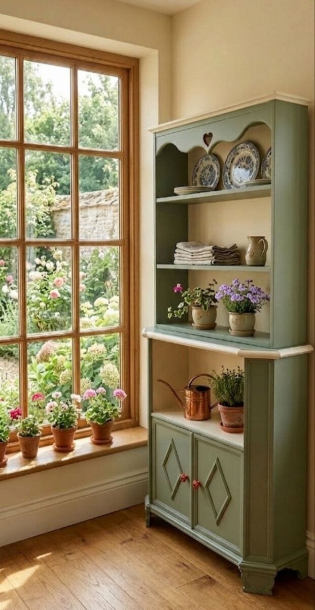 Rustikalna kredenca v žajbljevo zeleni barvi narejena iz dveh delov je podeželski stil za vaš dom. Dodajte svojemu domu pridih brezčasne elegance s to rustikalno kredenco, ki združuje funkcionalnost odprtih polic in shranjevanje v spodnji omarici. Ta kos pohištva je popolna izbira za vse, ki iščete kakovostno opremo v provansalskem ali cottagecore slogu.