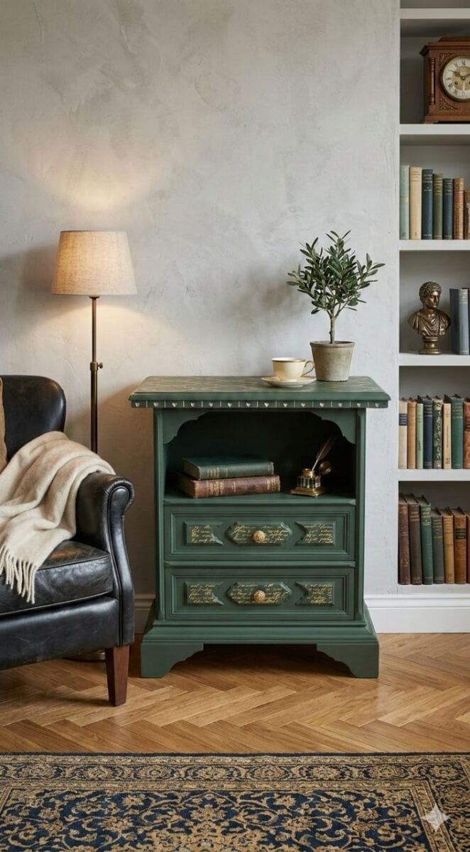 Predalnik združuje klasično retro eleganco s pridihom mistike in starinskega šarma. Zelena barva prinaša v prostor naravno toplino in se čudovito dopolnjuje z zlatimi dodatki, ki poskrbijo za prestižen videz.